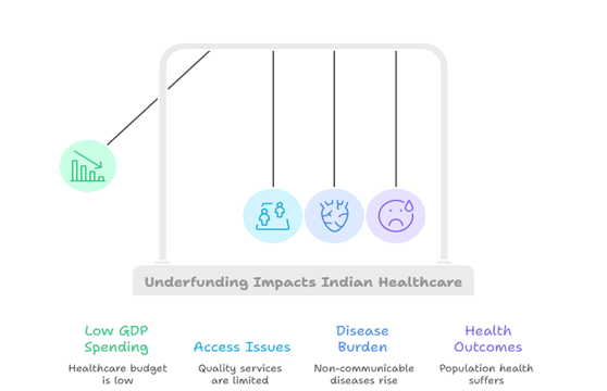 ●       India still spends far less on health than many countries roughly 80 USD per person per year, compared to a global average of over 1,300 USD and close to 6,000 USD per person in many OECD nations.