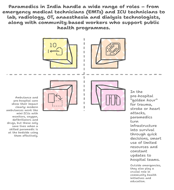 Paramedics in India handle a wide range of roles – from emergency medical technicians (EMTs) and ICU technicians to lab, radiology, OT, anesthesia and dialysis technologists, along with community based workers who support public health programmes. They are often the true first responders in emergencies, trained to assess situations, give life saving first aid, perform CPR, manage airways, give specific emergency drugs and stabilize patients during transport. Ambulance and pre‑hospital care show their impact clearly: modern ambulances work like mini ICUs with monitors, oxygen, defibrillators and drugs, but these only save lives when a skilled paramedic is at the bedside using them effectively. In the pre hospital “golden hour” for trauma, stroke or heart attacks, paramedics turn infrastructure into survival through quick decisions, smart use of limited resources and constant updates to hospital teams.